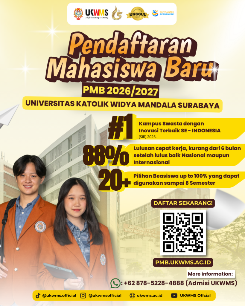 Dapatkan informasi berbagai kegiatan ketika bergabung di Universitas Katolik Widya Mandala Surabaya, karena belajar tidak hanya di dalam kelas melainkan juga beragam kegiatan yang mengasah kemampuan baik dari soft skill dan hard skill.