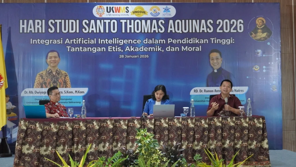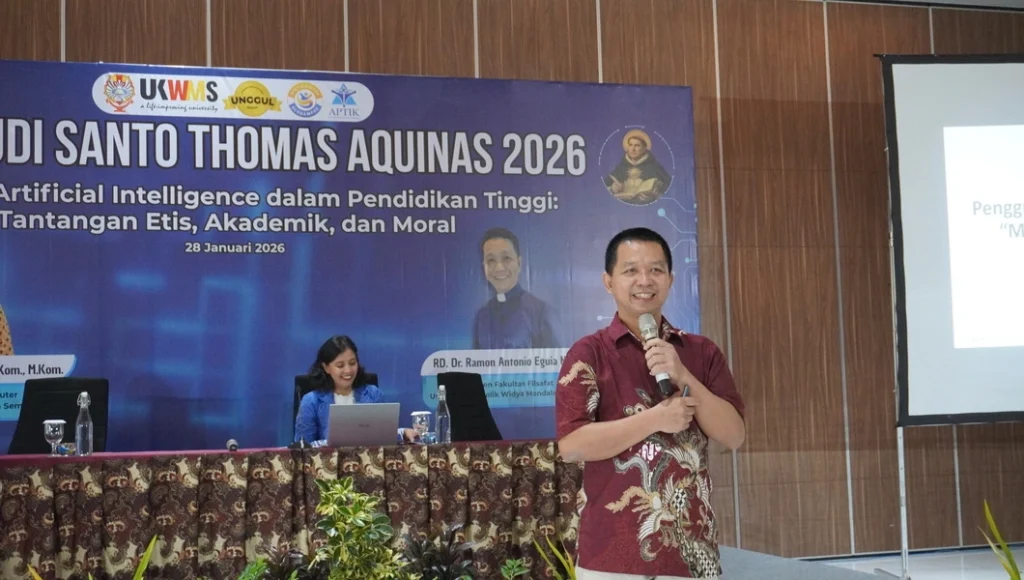 (UKWMS – 29/1/2026) – Universitas Katolik Widya Mandala Surabaya (UKWMS) kembali menegaskan komitmennya dalam menjawab tantangan perkembangan teknologi. Salah satunya, melalui penyelenggaraan Hari Studi Santo Thomas Aquinas 2026. Kegiatan ini mengangkat tema “Integrasi Artificial Intelligence dalam Pendidikan Tinggi: Tantangan Etis, Akademik, dan Moral”. Diadakan secara hybrid, diskusi ini dilaksanakan pada Rabu (28/1) di Ruang Widya Manggala – Widya Mandala Hall, Komplek Kampus UKWMS Pakuwon City.